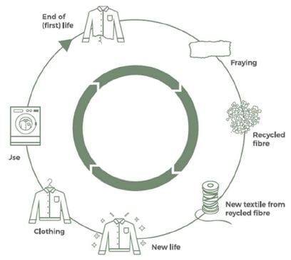 • Het circulair recyclen van oude kleding naar nieuwe garens voor kleding. Bij een volledig nieuw gebruik van de oude kleding wordt er zomaar tot 38% uitstoot bespaard. Het recyclen zal ook leiden tot CO2 uitstoot maar dit zal een stuk lager zijn dan het opnieuw verbouwen of winnen van grondstoffen.